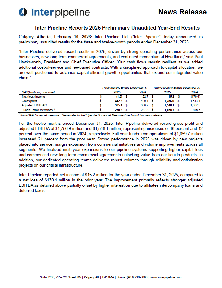 Calgary, Alberta, February 10, 2026: Inter Pipeline Ltd. (“Inter Pipeline”) today announced its preliminary unaudited results for the three and twelve-month periods ended December 31, 2025.